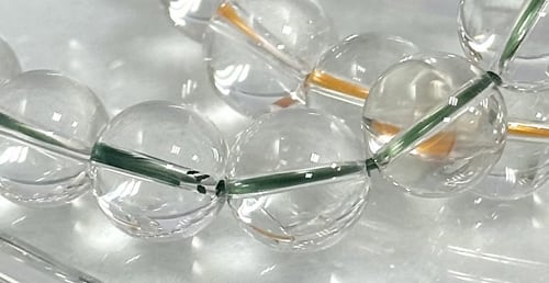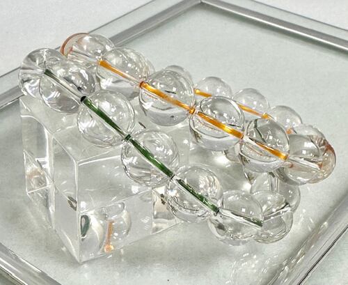 ゴム色が緑のものが右巻き水晶、オレンジのものが左巻き水晶になります。
