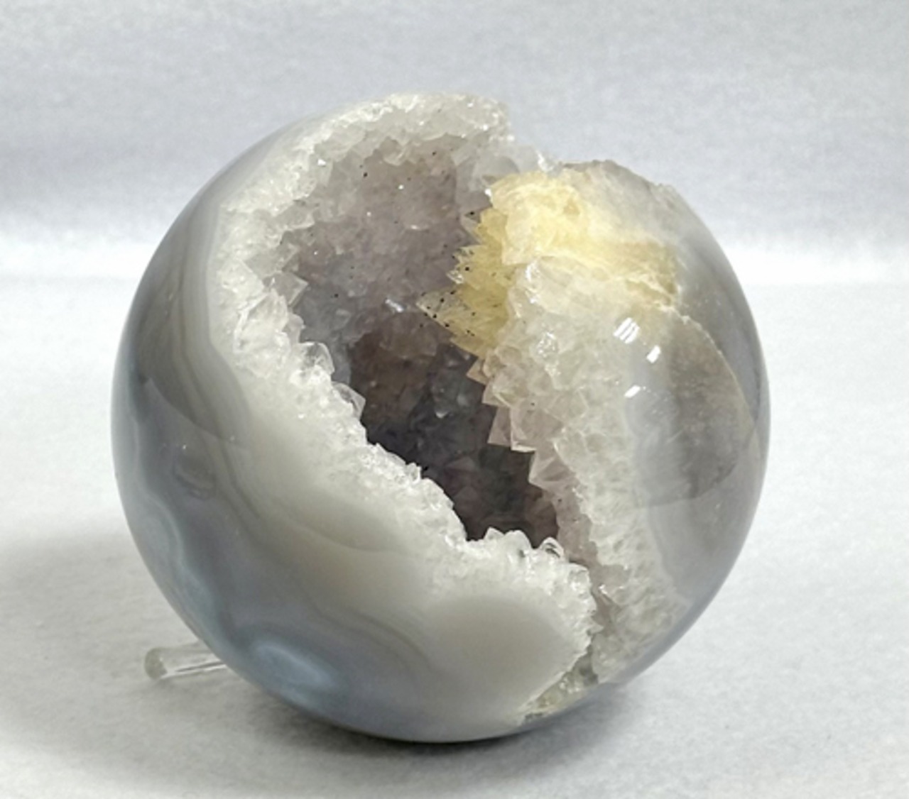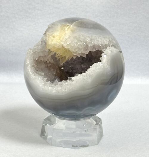 前歯のような部分のカルサイトと側のメノウ部分、そして中の結晶のキラキラがたまらないです。アクリル台付きでおすすめです。