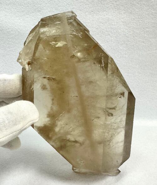 光線の具合によっては黄水晶にも茶水晶にも見え、またなんといってもこの迫力あるボリュームの中に見えるきれいな1本の白い糸筋、ファーデンがなんとも神秘的です!!