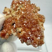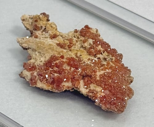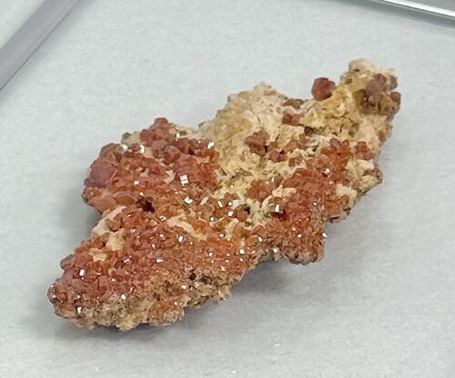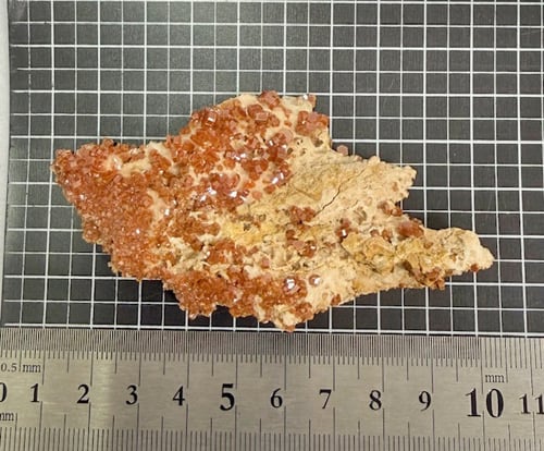モロッコ産、横幅約90ミリ、目視で確認出来る六方晶系の結晶がキラキラとオレンジの輝きを放ちます