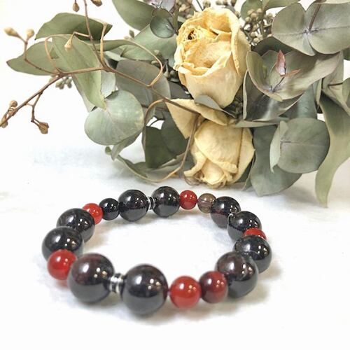 【 商品詳細 】◆商品コード PBR-415 ◆商品名 本能寺姉弟 じぇふデザイン ブレスレット 男性 ◆アイテム ブレスレット ◆価格 ¥7,360- ◆サイズ 12ミリ ガーネット×10、8ミリ カーネリアン×5、スモーキークォーツ×1、オニキス×1、レッドタイガーアイ×1、5ミリ ロンデル ブラック×5 内寸 約16cm ◆備考 *こちらはガーネットなどを使用した男性向けのブレスレットの商品ページになります。水晶などを使用した女性向けブレスレットは別の商品ページになります。