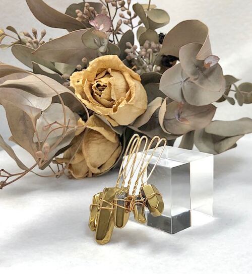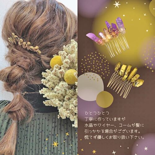 【 商品詳細 】◆商品コード PHA-121 ◆商品名 氷柱水晶 ヘアアクセサリー ゴールドカラー 5本足 ゴールドカラータイプ ◆アイテム ヘアコーム 5本足 ゴールドカラー ◆価格 ¥1,210- ◆サイズ ・全体 約53×40 ・天然石部分 約23〜42×8〜14×9〜14mm前後(個体差があります) ・コーム部分 ゴールドカラー 5本足 約2.3cmx3.5cm ◆備考 丁寧に作っていますが水晶やワイヤーが髪に引っかかる場合がございます。慌てず優しくお取り扱い下さい。1つ1つちがう形の水晶を固定するためワイヤー使用量や巻き方も全て違います。商品画像をご覧になって、ご検討くださいませ。