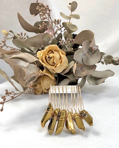 水晶 ヘアアクセサリー 氷柱水晶 結晶 ヘアコーム 金色 10本足 ゴールドカラー 天然石 パワーストーン 氷柱カット 氷柱クリスタル 結婚式 成人式