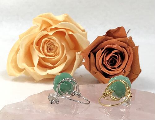 コロンと愛らしいバラの花の形の天然石をフリーサイズのワイヤーアートリングに仕立てました。