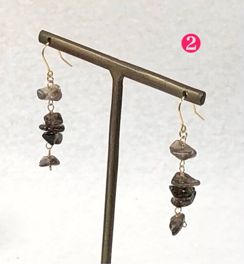 *商品お取り扱いの為にご一読お願いします。*使用しているピアス金具は全てサージカルステンレス316(SUS)本金メッキです。(メッキがお肌に合わないお客様はご使用をお控えくださいませ。)丸カンは真鍮本金メッキ、0.3mmワイヤーはアーティスティックワイヤーノンターニッシュブラスです。 <アーティスティックワイヤー> アメリカのArtistic wire社が製造しているジュエリー用の高品質金属ワイヤーです。ゴールド、ノンターニッシュシルバーは銅線芯に銀メッキ、金メッキ、更にその上から エナメル加工とポリウレタンのクリアコーティングが施されています。明るいメッキ色を長く楽しめます。 ノンターニッシュブラスは真鍮線にポリウレタンのクリアコーティングで真鍮そのものの色を長く楽しめるようになっています。(こちらは真鍮の為、銅線芯のものより少し硬さがあります。) しなやかで適度な柔らかさがありますので天然石を傷付けづに優しくラッピング(巻いたり包んだり)出来ることや、製作したリングやイヤーカフの着け心地が軽やかで痛くなりにくい点がアーティスティックワイヤーの良いところだと思い使用しています。反面、ご自身の指の力でフィットさせれる程の柔らかさですので手のひらで強く握りこむなどの強い圧力がかかると変形してしまいます。なるべく優しくお取り扱い下さいませ。お手入れの際は乾いた布で軽く拭いて下さい。【 商品詳細 】◆商品コード KPI-002 ◆商品名 さざれのショートチェーンピアス ◆アイテム ピアス ◆価格 ¥990- ◆サイズ 全長 約34ミリ前後(ピアス金具含む) 材質:ピアス金具 サージカルステンレス316(SUS)本金メッキ・ 丸カン 真鍮本金メッキ ・0.3mmワイヤー アーティスティックワイヤー(ノンターニッシュブラス)使用 ・ 天然石 (1)ガーネット (2)スモーキークォーツ (3)ラブラドライト (4)ムーンストーン ◆備考