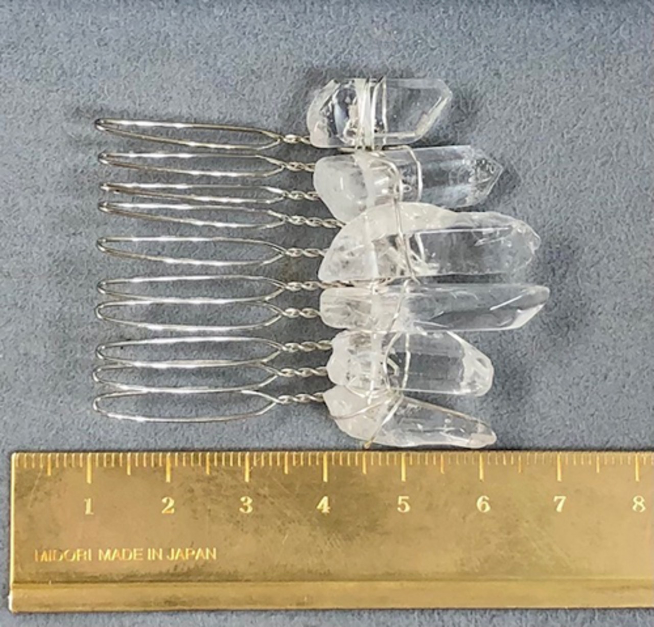 【 商品詳細 】◆商品コード PHA-128 ◆商品名 氷柱水晶 ヘアアクセサリー シルバーカラー 10本足 ナチュラル 磨きタイプ ◆アイテム ヘアコーム 10本足 シルバーカラー ◆価格 ¥1,320- ◆サイズ: ・全体 約58×47ミリ ・天然石部分 約17〜35×5〜10×5〜10mm前後(個体差があります) ・コーム部分 シルバーカラー 10本足 約4.1cmx3.7cm ◆備考 丁寧に作っていますが水晶やワイヤーが髪に引っかかる場合がございます。慌てず優しくお取り扱い下さい。1つ1つちがう形の水晶を固定するためワイヤー使用量や巻き方も全て違います。商品画像をご覧になって、ご検討くださいませ。