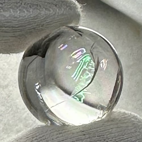 ブラジル産、約22ミリの螺旋水晶丸玉。吸い込まれそうなほど鮮やかに虹が浮かび上がります